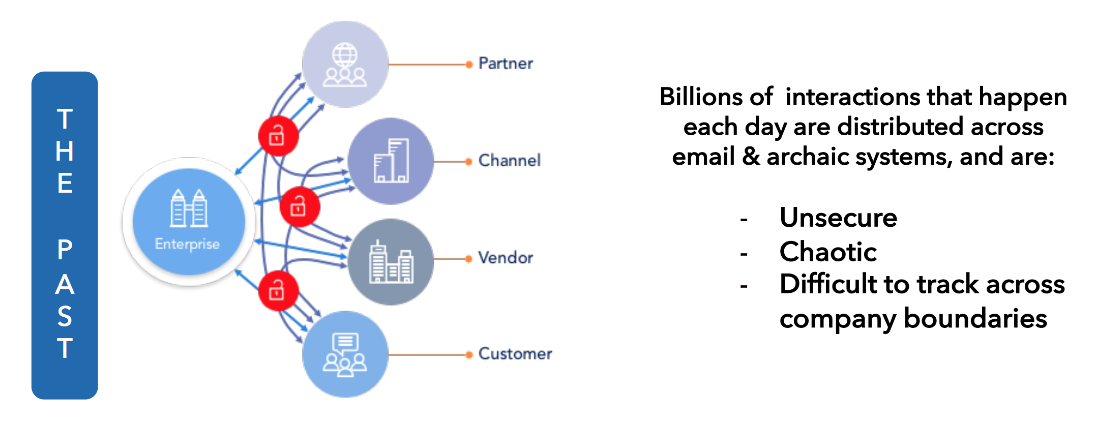 Сегодня процесс установления партнерских отношений между предприятиями хаотичен. Как правило, взаимодействие происходит в переписке по электронной почте и в мессенджерах. В большинстве случаев люди даже не знают друг друга, не знают истинных мотивов собеседников. Это приводит к недоверию и потере прибыли. И наоборот, это часто приводит к утечке стратегической информации от предприятия. Например, во время аудита системы менеджмента качества поставщика перед предполагаемым вступлением в партнерские отношения. По данным аналитического агентства Zdnet, потери организаций только от промышленного шпионажа составят в 2018 году 2 триллиона долларов.