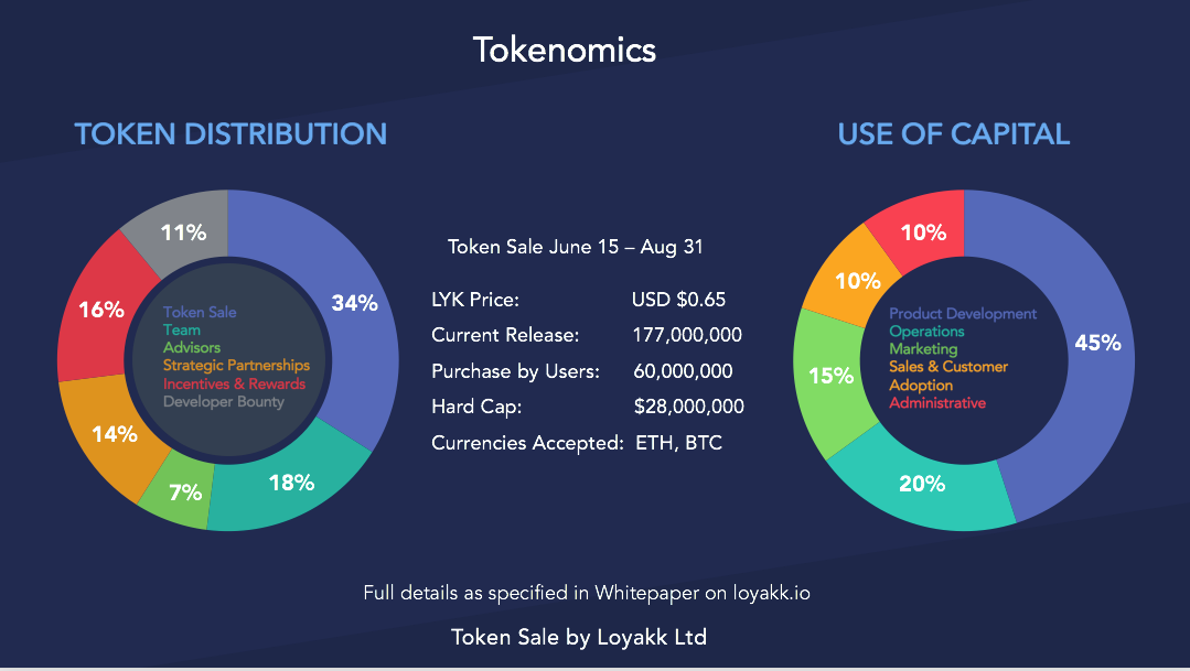 Loyakk выпускает токен LYK. Он предназначен для транзакций внутри системы и предоставляет смарт-контракты. Функция LYK, помимо оплаты, заключается в контроле за передачей данных между участниками. Токен LYK также участвует в аудитах системы менеджмента качества компании, так как может соответствовать многим требованиям международных стандартов производства.
