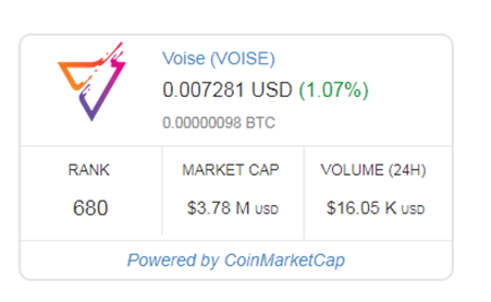 VOISE is a blockchain powered anonymous decentralized platform with personalized token based on Ethereum's smart contract ecosystem for transactions. VOISE is an innovative cryptocurrency powered solution for the music industry that allows artists to monetize their work in a collaborative P2P marketplace. They can set a price for their works, provide free sample tracks and seek support from music enthusiasts and users on the platform.