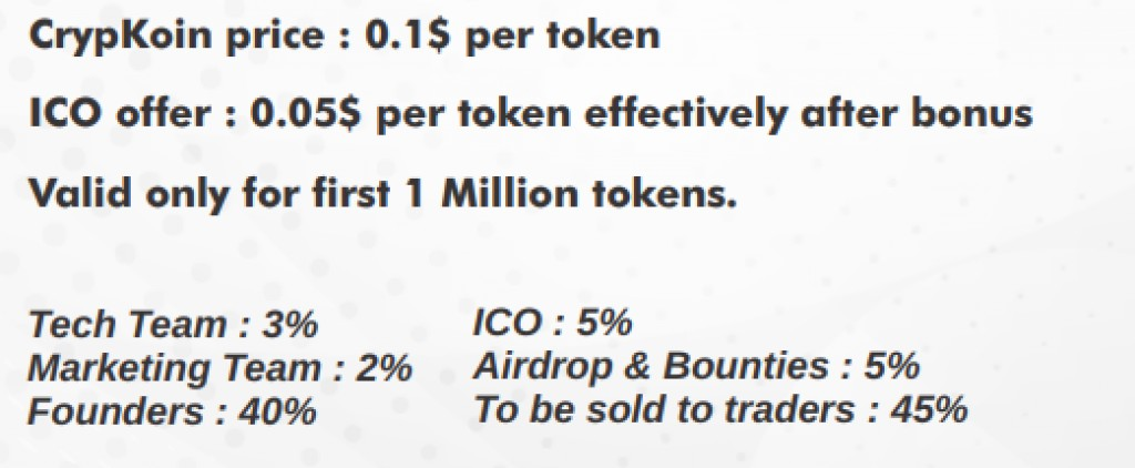 The CrypKart Exchange akan menerbitkan token cryptocurrency sendiri, yang disebut CrypKoin (CKN). Batas ketat 1 Milyar CKN akan dibuat, tidak pernah ditingkatkan. CKN akan berjalan secara native di blockchain Ethereum dengan standar ERC20. DalamICO, CrypKart akan menawarkan 100% bonus CrypKoin kepada investor awalnya untuk 1 juta token pertama.