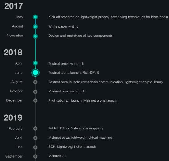 The Platform have released their first Testnet preview, StoneVan, on April 20, 2018. Their next code release will be Testnet Alpha in late June, which will include the first implementation of our full Roll-DPoS consensus scheme with voting support. IoTeX’s long-term plan focuses on building IoTeX subchains, software development toolkits (SDK), and developer tools, as well as collaborating with IoT companies / developers to build DApps utilizing the IoTeX platform.
