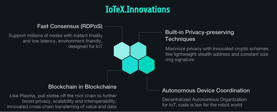 At a high level, IoTeX's competitive advantage stems from four main innovations: 1. Blockchain-in-blockchain architecture which ensures privacy and prevents IoT information leakage; 2. Built-in privacy based on lightweight cryptography; 3. Real-time consensus with instant finality, which improves the throughput of the network, reduces transactional costs, and enables efficient cross-chain communication; and 4. Subchain-as-a-service (SAAS) to facilitate fast prototyping and production of new IoT applications and ecosystems.