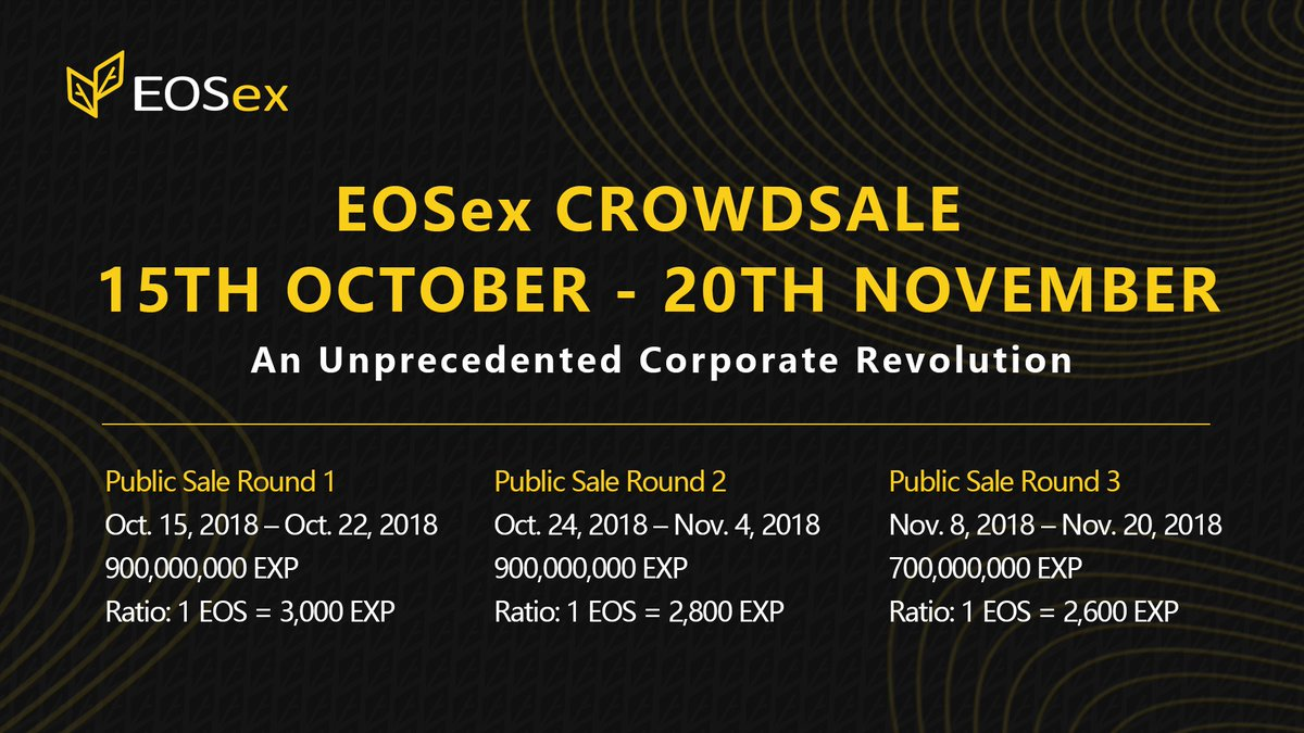 Public Sale Round 1 Oct. 15, 2018 – Oct. 22, 2018 900,000,000 EXP Ratio: 1 EOS = 3,000 EXP Public Sale Round 2 Oct. 24, 2018 – Nov. 4, 2018 900,000,000 EXP Ratio: 1 EOS = 2,800 EXP Public Sale Round 3 Nov. 8, 2018 – Nov. 20, 2018 500,000,000 EXP Ratio: 1 EOS = 2,600 EXP