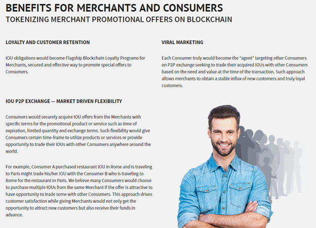 IOU is an example of the great technological breakthrough stated above. “It aims at empowering blockchain Merchants and Consumers with decentralized and secure Peer-to-Peer technology driving customer satisfaction and loyalty through Merchant’s trade-able IOUs”.