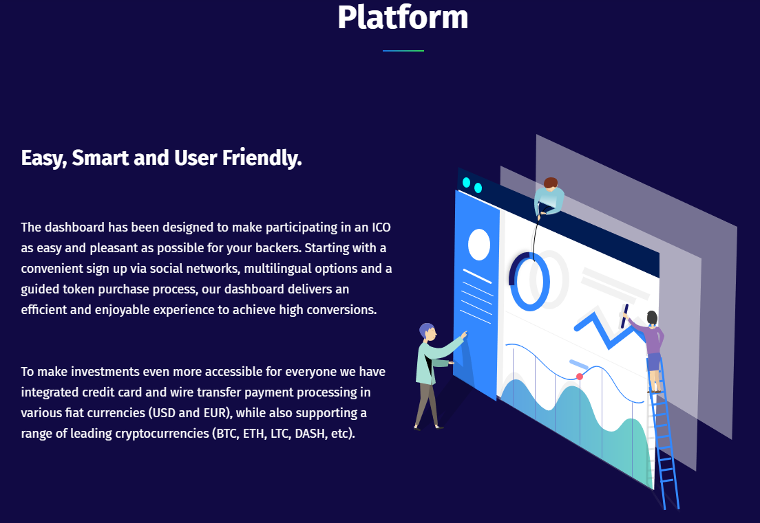 For the work of users on the platform, a unique fully customizable software solution in the form of a toolbar was developed in order to make the launch and participation in the ICO extremely simple and comfortable. For users implemented an elementary method of registration, including through social networks. The software shell supports many languages and has a friendly intuitive user interface. Anyone will be able to invest in the ICO project with a few simple steps, and it will be possible to pay in various Fiat currencies (USD, EURO) using Bank cards and transfers, as well as in a more traditional way for ICO, since the platform will support payment by leading cryptocurrencies (Bitcoin, Ethereum, LiteCoin, Dash, etc.).