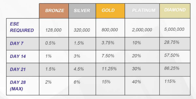 This program is to reward the loyal. If you accumulate and hold enough ESE tokens to reach any of the 5 tiers, you will be rewarded extra bonus percentages on top of the Staking Rewards. If you hold the required amount of ESE, you will earn the respective bonus of that tier level. You will receive this bonus amount on top of the daily regular Staking Rewards bonus. There is a maturity period to reach the maximum bonus reward. Every 7 days you achieve 25% of the maximum bonus reward. This means that after 28 days, you will reach your maximum bonus reward.