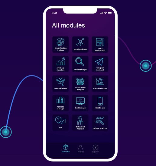 The project team has developed a special software which includes 12 modules that are responsible for the analysis of cryptocurrency behavior of the current market and separately analyze data charts and the behavior of the coin. Users get access to the platform through its own key, after which he gained access to the functions of the platform. Users in real time set the parameters that interested him. For example, can track news from social networks, news from pages that surely interesting to him, foreign innovations pertaining to the Exchange. The user also set the frequency of notifications, thus preparing it for themselves the most effective way of a system is most needed for trade.