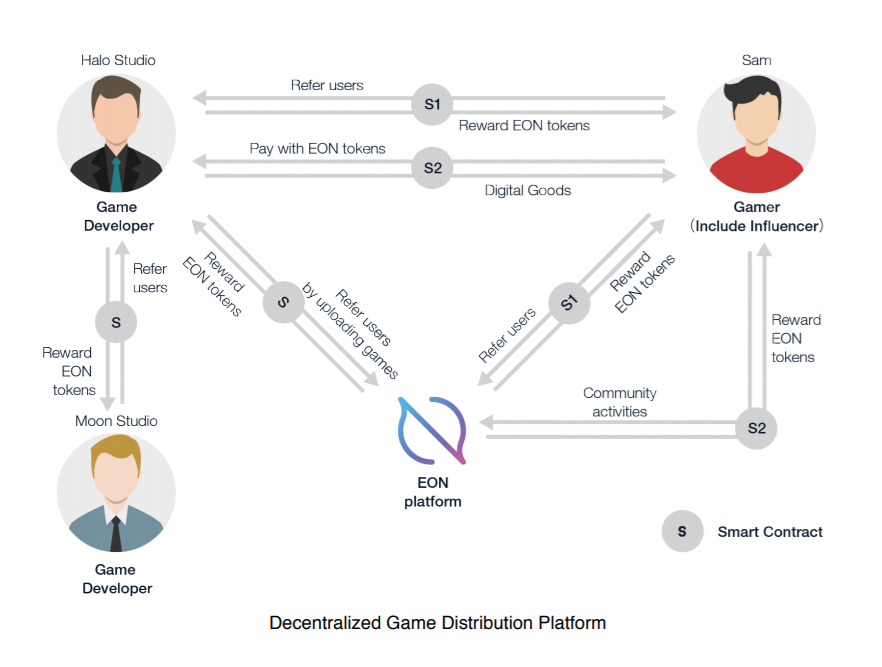 Вся глобальная система состоит из разных частей: система обнаружения игр, игровое сообщество, реферальная система, сообщество разработчиков. Токены EON являются центром платформы, данный токен разработан для экономического стимула игроков, помогающих развитию платформы.