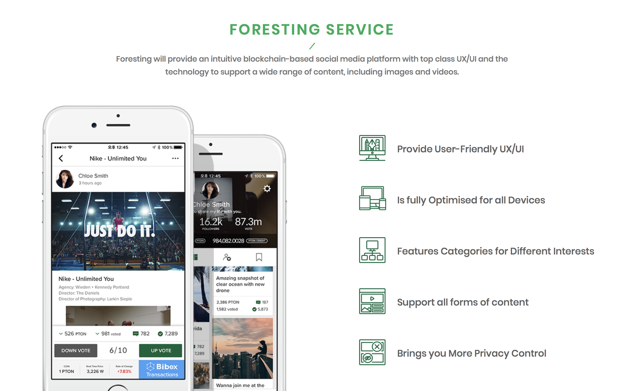 Foresting is a blockchain based social media platform that deviates from the distribution system of traditional social media platforms. It provides a fair value distribution system for users who are the true owners of the platform. They deliver content through blockchain technologies and contribute to platforms in a variety of forms.