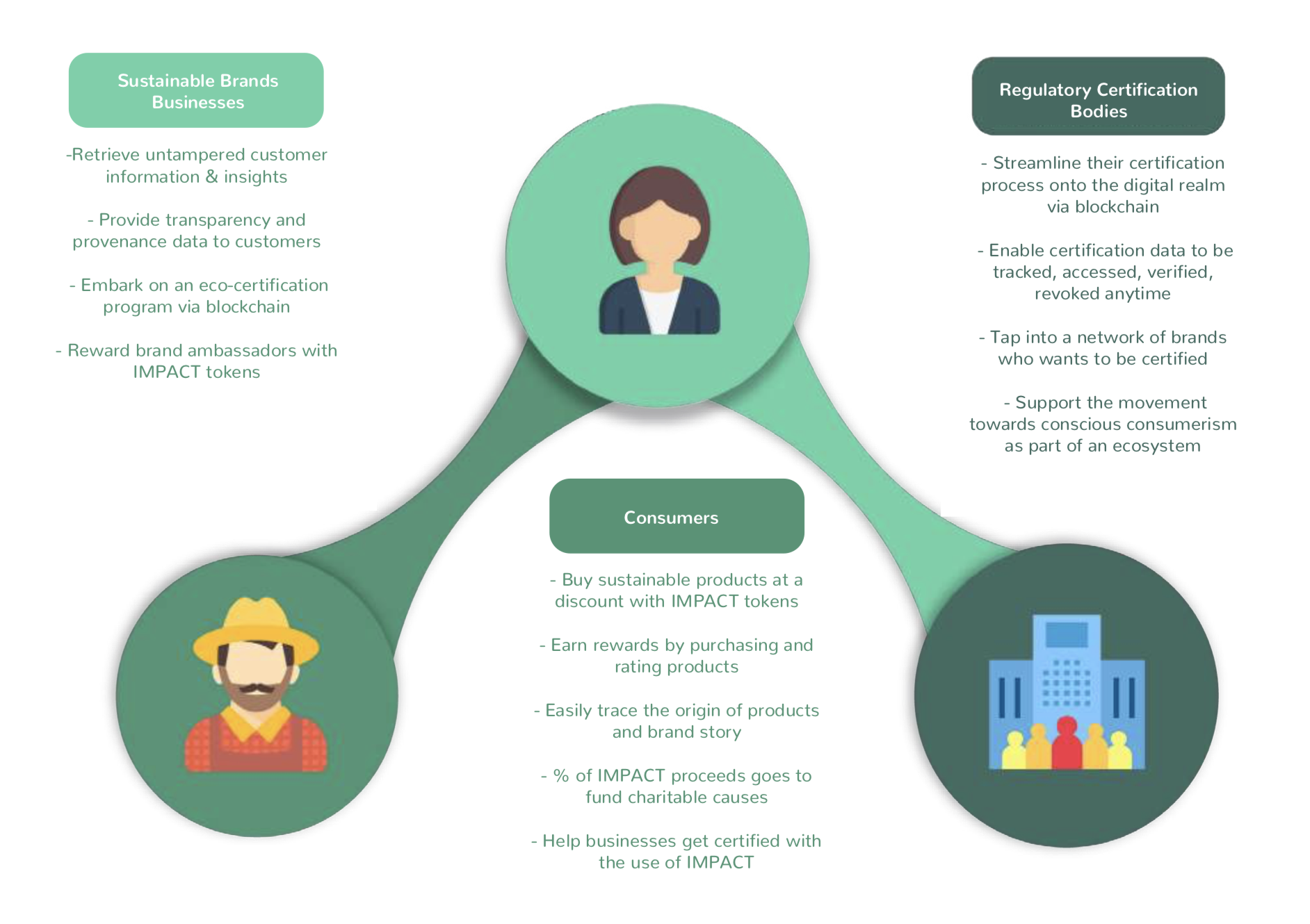 IMPACT is Utility Token, IMPACT is the overarching token used in the ecosystem to promote authentic and informed transactions between businesses and consumers. It is utilized for the administration of the rating system and also as the unit of account for all economic transactions within the ecosystem. Each stakeholder in the ecosystem is incentivized to utilize the token.