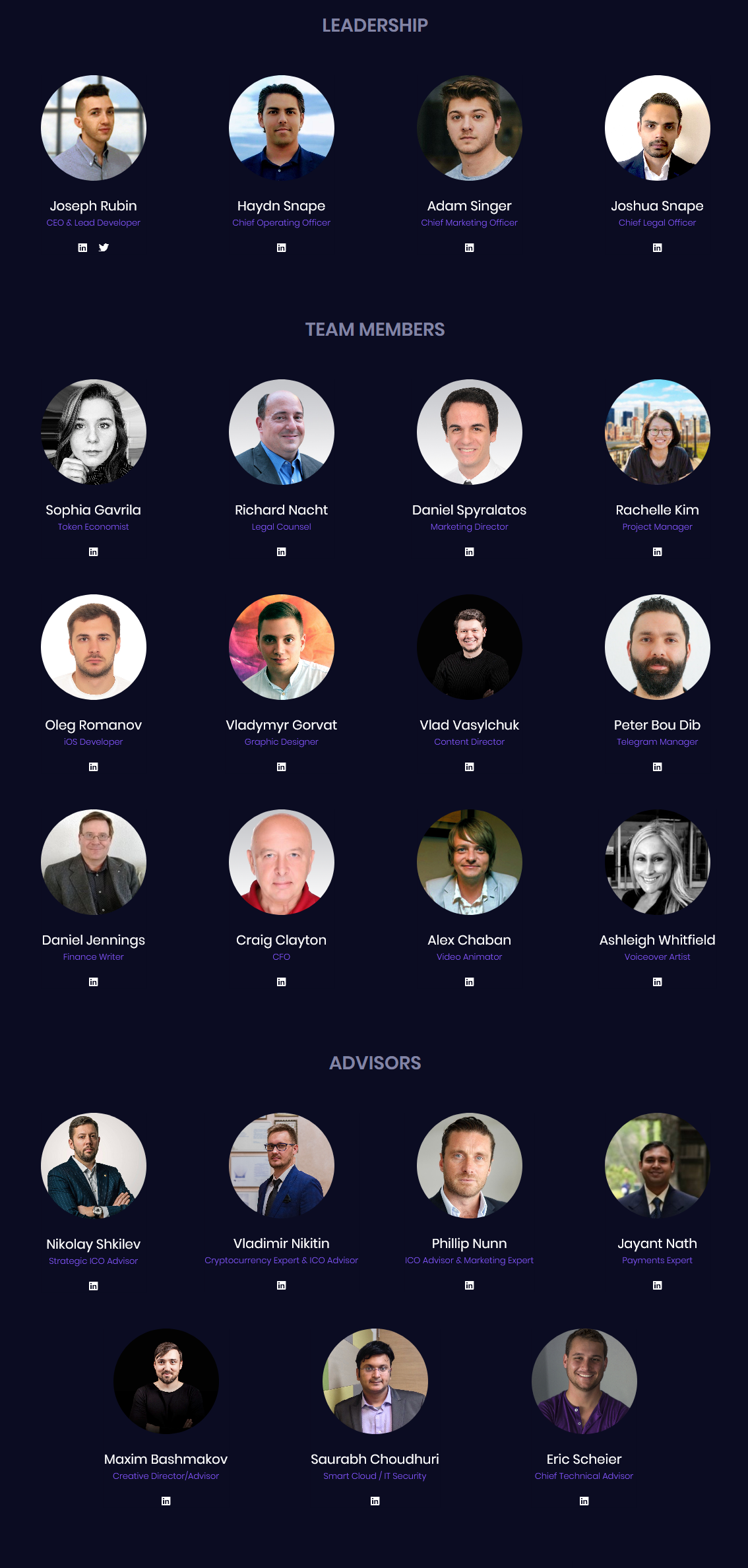 The advisory board consists of seasoned ICO Advisors, Financial Advisors, Investors, Managers who also bring together their experience in areas of Cloud/IT Infrastructure, Payments, Agreements, Business Development, Blockchain, Investments and Finance.