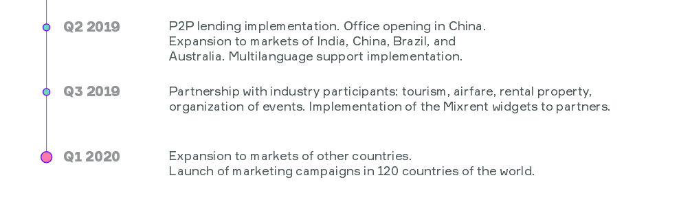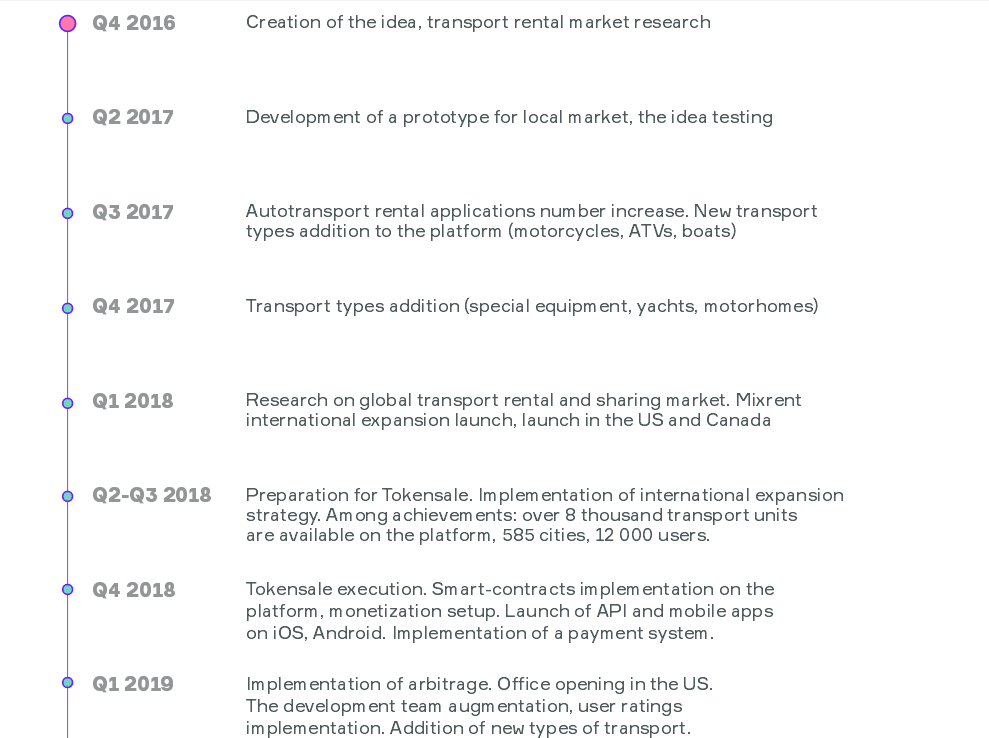 According to the project plan, we will launch mobile applications for iOS and Android, along with widgets and an API for travel and other partner sites. We are not just another project in the field of short- and long-term leasing of transport. The objective of the project is to completely transform the existing model of transport leasing and evoking the right emotions with the unique adventures that we create. We strive to develop a high-quality service and launch a model conducive to unlimited growth of the MIX token. Mixrent conducts tokensale with an operational product which is under active scaling and is consistently used by clients. Tokensale is aimed at the business to be transformed into a decentralized ecosystem which saves time and expenses for renting transport and encourages scalability.