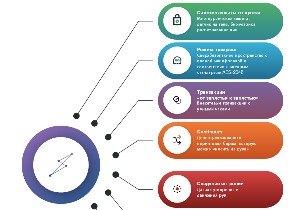 Так же,компания Sidera разрабатывает новую,децентрализованную биржу "CONTINUUM" которую можно запросто носить на руке.Данная биржа будет работать на всех устройствах BitSmart которые носят миллионы людей по всему миру.Представьте,что вы запросто сможете торговать криптовалютами простыми нажатиями кнопок.Быстрый и модульный блокчейн от Sidera мгновенно обрабатывает платежи и проводит до 500 тысяч операций каждую секунду.