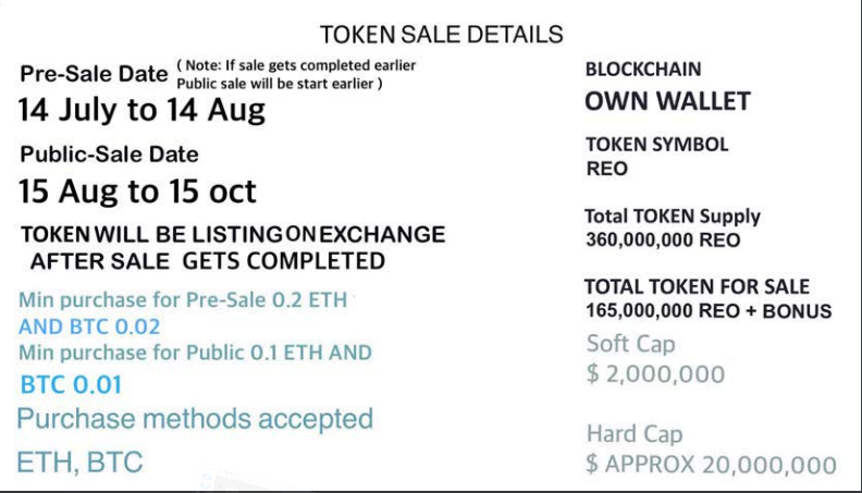 Mục tiêu chính của REO là trở thành mạng cryptocurrency dựa trên khối chuỗi đa tài sản lớn nhất thế giới. Chuỗi Careon đang phát hành một (ICO) của REO.