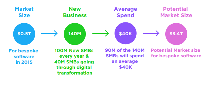 Mỗi năm, 40 triệu doanh nghiệp trải qua một chuyển đổi kỹ thuật số yêu cầu giải pháp được xây dựng tùy chỉnh. 100 triệu doanh nghiệp mới gia nhập thị trường. Chi tiêu trung bình cho 90 triệu trong số các dự án đặt biệt này là $ 40,0006. Trong ba năm, thâm nhập thị trường chỉ 0,0018% sẽ cung cấp doanh thu 60 triệu đô la, trong vòng ba năm.