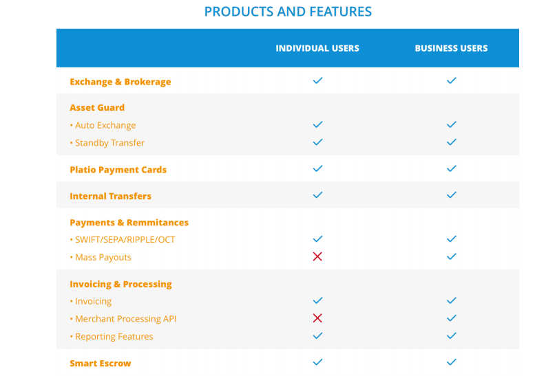 Ứng dụng của Platio sẽ có sẵn trên iOS và Android, cũng như ứng dụng dựa trên web. Hệ sinh thái ngân hàng thông minh Platio sẽ bao gồm nhiều sản phẩm và tính năng khác nhau hoạt động cùng nhau để cung cấp cho người dùng một quy trình giao dịch liền mạch. Platio sẽ điều chỉnh sản phẩm của mình theo nhu cầu của cả cá nhân và doanh nghiệp, đảm bảo rằng cả hai đều tận hưởng khả năng tiếp cận được cải thiện để giao dịch bằng tiền điện tử. Với ý nghĩ đó, Platio có ý định tạo ra các sản phẩm sau với các tính năng độc đáo cho cả cá nhân và doanh nghiệp.