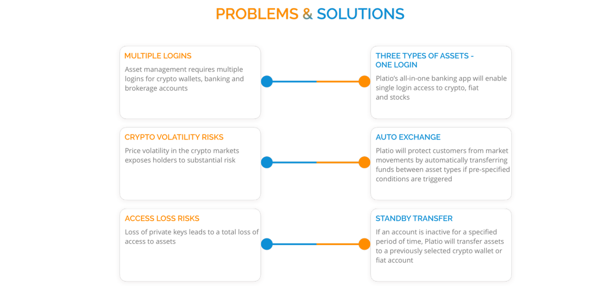 Các ngân hàng truyền thống rất chọn lọc trong các dịch vụ mà họ cung cấp cho người dùng mật mã trong hệ thống ngân hàng hiện tại của họ. Họ đã không chấp nhận thời đại tiền xu kỹ thuật số, hoặc cách tiền điện tử đã phát triển. Platio giải quyết vấn đề này dễ dàng truy cập vào Hệ sinh thái Platio, sử dụng mã thông báo các tài sản dựa trên công nghệ EOS, và hỗ trợ ba loại tài sản: mật mã, fiat và chứng khoán. Cụ thể, mục tiêu của Platio là cung cấp các giải pháp cho người dùng mật mã như sau: