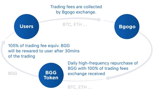 One of the most exclusive features the Bgogo’s mining system will have is that it is claimed to produce a high-frequency trading fee rebate. Another name of this process is mining through trading and that means holders of some number of BGG tokens will have a 105% rebate in the form of a trading fee in only half an hour after the trade is complete. This means user has his interest to be effectively paying a negative trading fee using the Bgogo’s exchange platform.