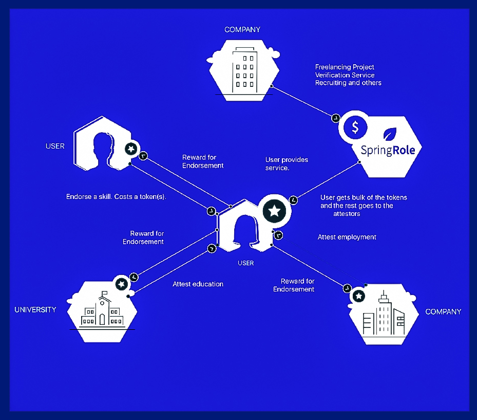 It is not easy to perform attestation effectively due to some drawbacks of current attestation procedures. First off, most attestation procedures take way to time, money and other resources precious to firms. The industry lacks a practical generalized method that can reduce the amount of overhead costs seen in the current attestation processes, yet can maintain the truthfulness of the information being attested. In attesting education background, for example, an interviewer should be in contact with the administration professionals in their alma mater (college they graduated from) and ask the necessary questions, such as whether or not the candidate was enrolled at their college, during what time frame was the applicant enrolled, and what courses were taken by this applicant. The interviewer should, at a later time, confirm with another professional at said college regarding the applicants skills, if said applicant is trying to gain attestation of their skills with the interviewer. Firms can spend a considerable amount of time during the attestation procedures, which most of the time, is often longer than the interview itself. In order to address the aforementioned problems regarding the poor nature of current attestation procedures, the SpringNetwork has already prepared some mighty fine solutions. First, SpringRole creates a verified resume to use and ultimately share with the SrpringNetwork. The resume contains three categories of information educational background, work experience, and relative skills obtained from previous work experience. Once the information is attested, it will be immutably stored on their Block chain. The SpringRole Platform will use an endorsement to crowd sourced particular skill sets. In addition, the SpringRole Platform will implement organizational attestation to verify and validate professional details.