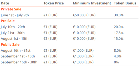 The ICO is live on with 30% bonus on offer at the moment. Do participate. Note that, rate and conversion are calculated every minute. The following picture shows the phases of the ICO, their dates, minimum accepted investment and the bonuses available.