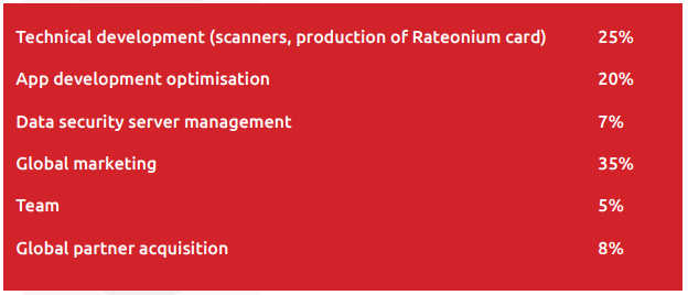The ICO is intended to generate a network of customers and partner companies for the system, sufficient for the overall concept to work. With the inclusion of numerous partners such as store chains, delivery services, vehicle rental companies, and restaurants, this entrepreneurial functionality has already been ensured in the early development phase for Rateonium. Networks often face the problem of too few suppliers or parties interested in acquiring the product by the time the system is launched. The Token Sale event makes it possible to integrate a six figures worth of users directly into the system, ensuring a very appealing number of potential new customers for companies.