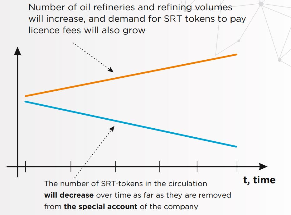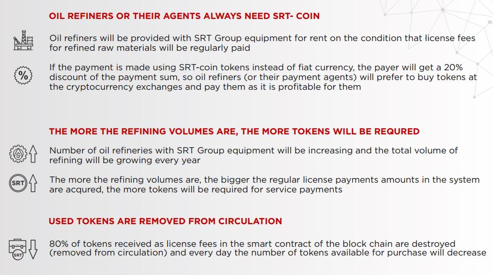 Oil refineries or their agents will have an option to make payment to SRT Group via SRT Coin. If they prefer this option, they will pay 20% less to SRT Group. In order to achieve this, they need to buy SRT Coin from exchanges which will automatically raise the demand to coin and increase its’ price. It is expected that every year the number of refineries with SRT Group equipment will increase which will increase the value of token persistently. In addition to this, 80% of the tokens received as licence payment via SRT Blockchain platform will be burned which will result in decrease the number of tokens. This will also increase the value of token.