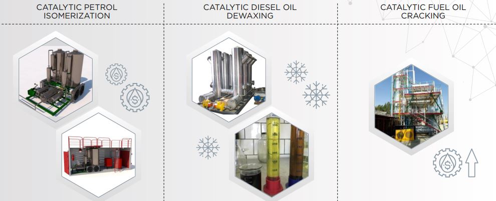 - ‘Catalytic Fuel Oil Cracking Module’ enables preparation of light petroleum products (gasoline and diesel fuel) from fuel oil. It increases the depth of oil processing at small oil refineries up to 85%, and raises the levels of business profitability.