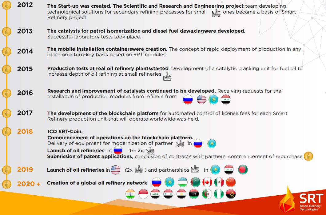 Starting in the year 2012, project completed successfully various milestones up to now. Upon completing ICO, SRT will launch oil refineries in Russia, submit patent applications, conclude contracts with partners and start buying tokens in 2018. In 2019, oil refineries in USA, Kazakhistan, Iraq and Bangladesh will be implemented. In 2020, creation of global oil refineries network will be done.