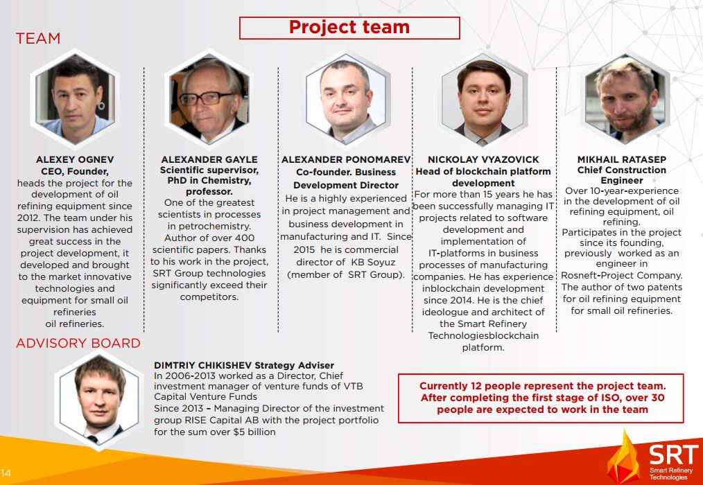Team is composed seasoned professionals on the field of operation and design of oil refineries, petrochemicals, IT, software development. Research Supervisor of the project Alexander Gaile is a Professor at the Department of Technologies of Petrochemical and Coal Chemical Industries of Saint Petersburg Institute of Technologies since 1977. Author of more than 400 scientific works, including 30 monographs and manuals, 70 copyright certificates and patents, and received many state awards. Alexander Ponomarev, (Co-founder, Business Development Director) is a highly experienced professional in project management and business development in manufacturing and IT. Nickolay Vyazovick is the Head of Blockchain Platform development. Nickolay has more than 15 years of managing IT projects related to software development and implementation of IT Platforms in business processes of manufacturing companies. He also have blockchain development experience since 2014. Vitaly Kuzik, Technical Director, has more than 20 years of experience in oil processing including supervision of 5 mini refinery construction. Mikhail Ratasep is the Chied Design Engineer of SRT Group. Mikhail has more than 10 years of professional experience in the development of oil processing equipment.