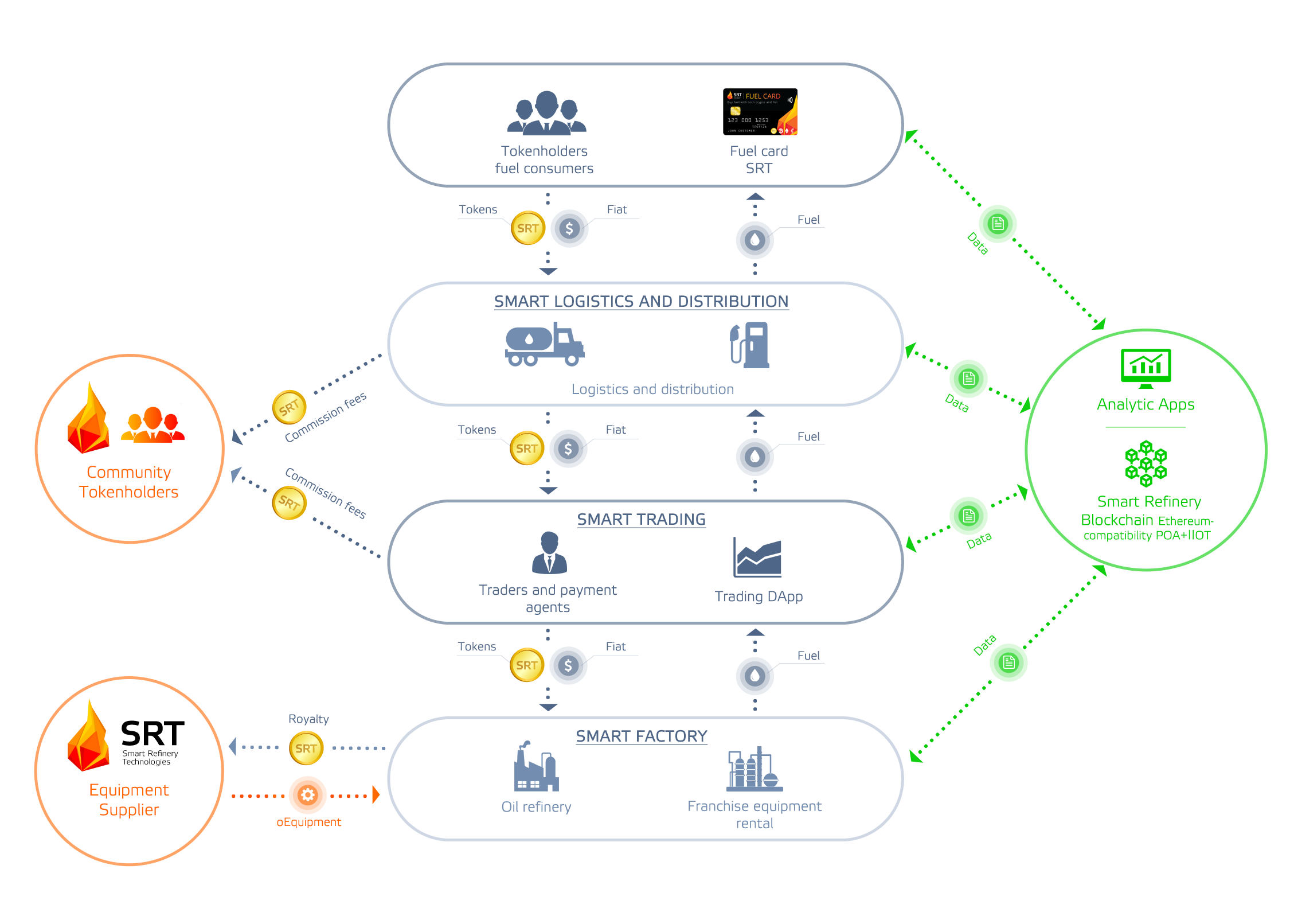 - Blockchain-based decentralised petroleum exchange: KYC of trading participants in blockchain, smart contract-based clearing, AI-system to help traders, payment of commissions of SRT tokens