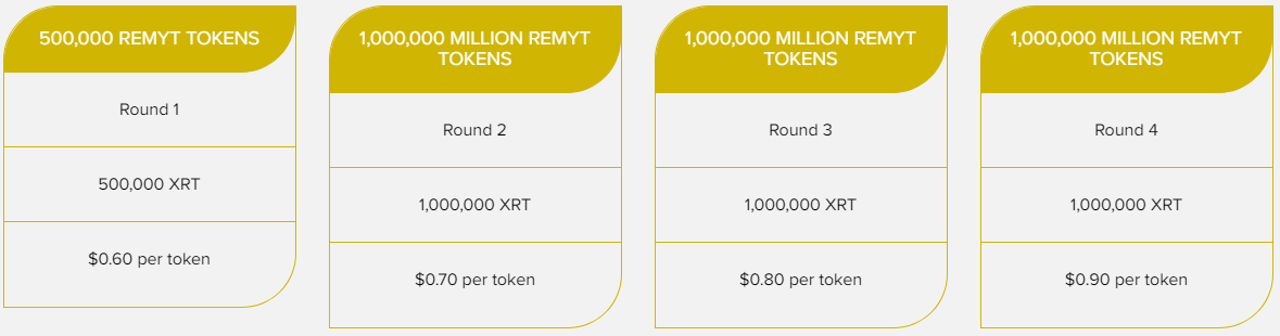 Remyt will issue an ERC20 Remyt Token (XRT) for its ICO, which will be utilized as a medium of exchange in the Remyt Ecosystem.
