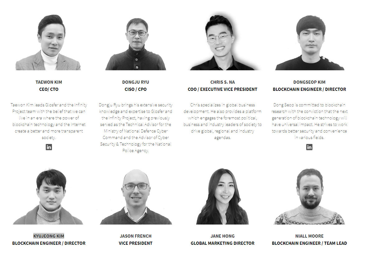 - TAEWON KIM - Убежденный сторонник технологии блокчейн и криптовалют, верит, что происходит техническая революция и она сможет внести изменения в текущую непрозрачную коррумпированную систему, является главным исполнительным директором а также лидером таких команд, как Infinity project и Glisfer