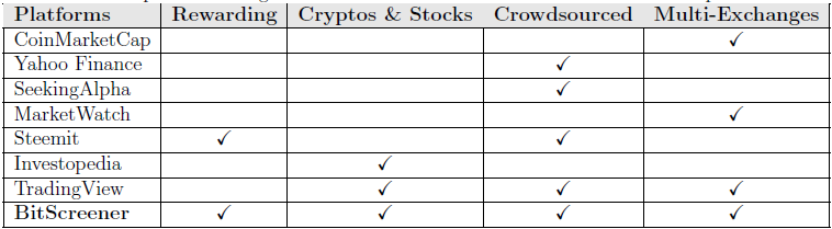 BitScreener is unique compared to other platforms. In particular, it's very different from the Steemit platform. BitScreener addresses the specific issues of the financial world while Steemit is a multipurpose blog. In addition, BitScreener also differs from other platforms such as CoinMarketCap, Yahoo Finance, SeekingAlpha, Investopedia, and TradingView because it has a community forum with rewards based on performance-based and blockchain-based tokens. And combine primitive financial data systems with user-generated content and integrated equity markets in the new crypto market - all within a single ecosystem. The table above compares BitScreener with some common platforms.
