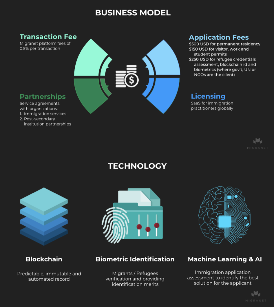 Migranet’s mission is to optimize immigration-related processes through the use of Artificial Intelligence, Biometrics and Blockchain technology. This will improve speed, fairness, accuracy, and accountability throughout the global migration system. Migranet believes that offering a utility token for migration services will provide unbanked migrants (and other applicants) full transparency and fairness for all services provided on the platform. Furthermore, Migranet maintains that without a radically transparent and automated system, immigrants worldwide will continue to be marginalized by the inefficiencies of current immigration practices, which stand to worsen as globalization, population, size, and immigration increases. Migranet empowers individuals to exercise their born right to explore the world in a secure and reliable way.