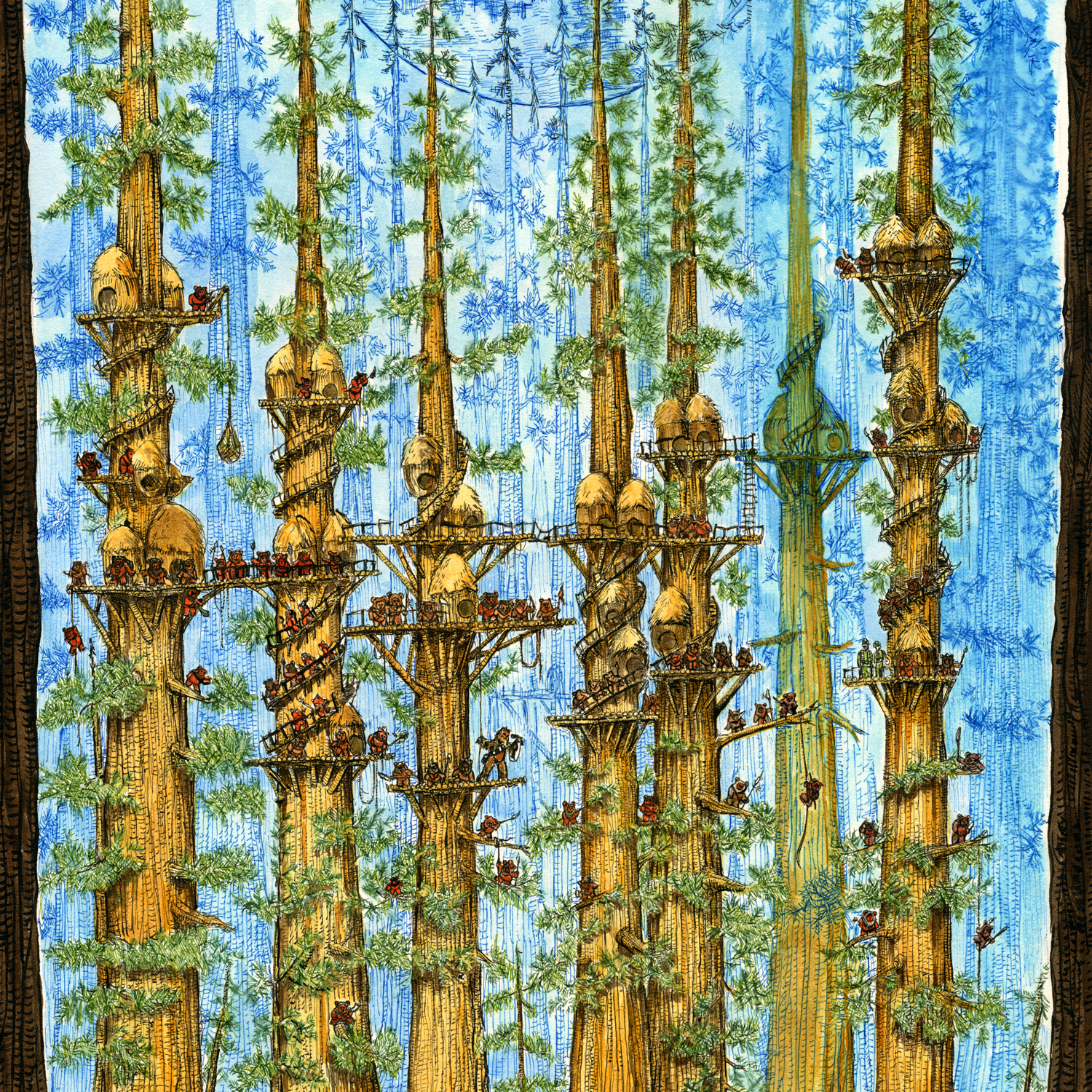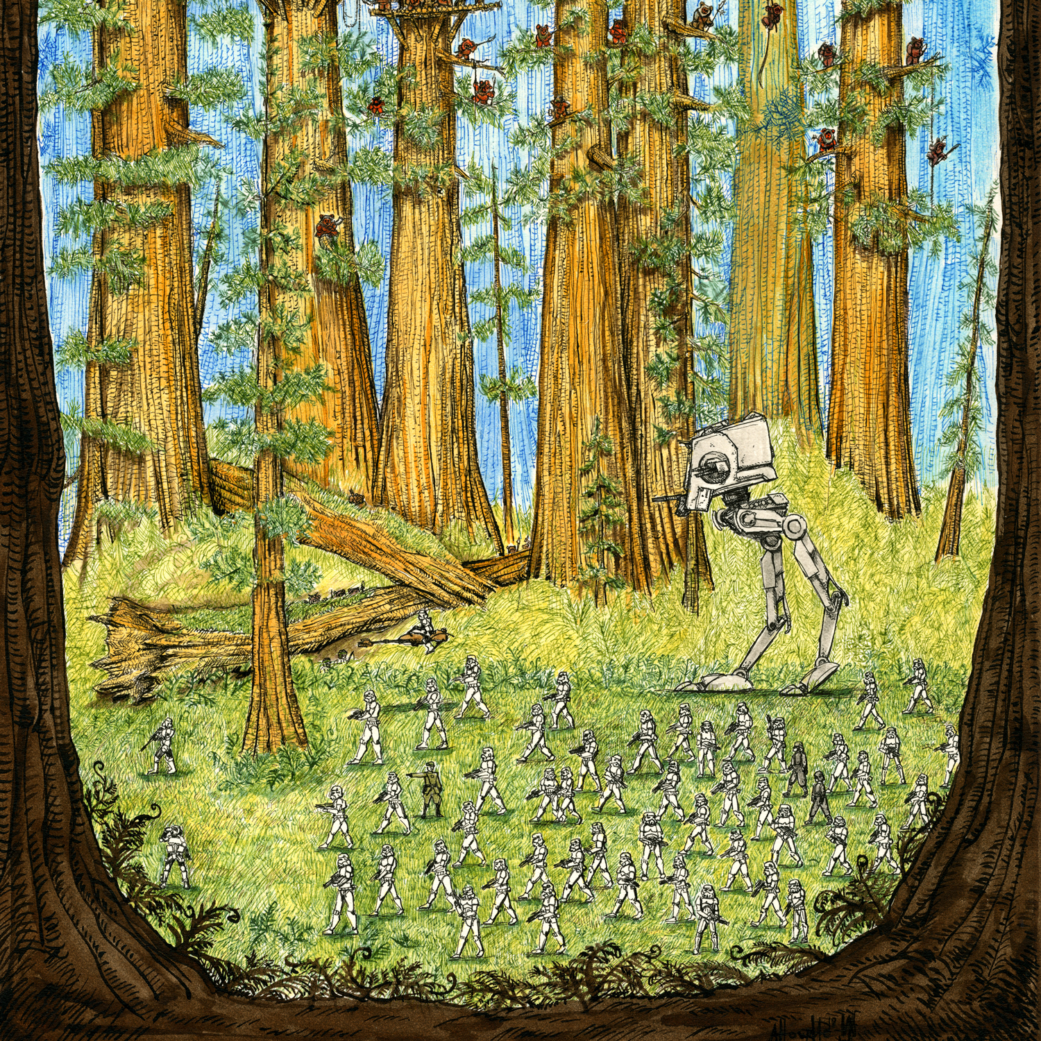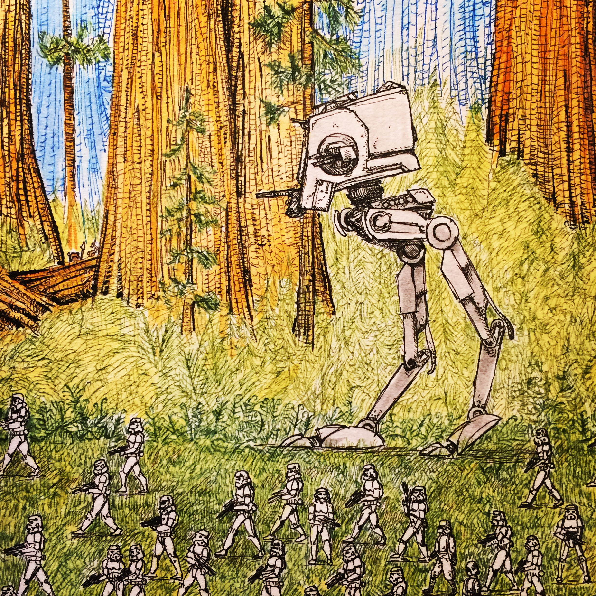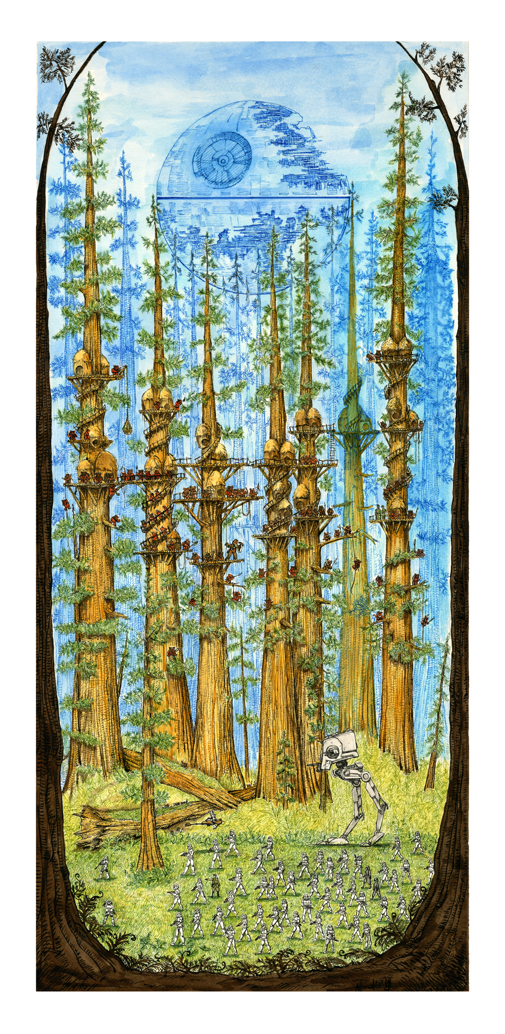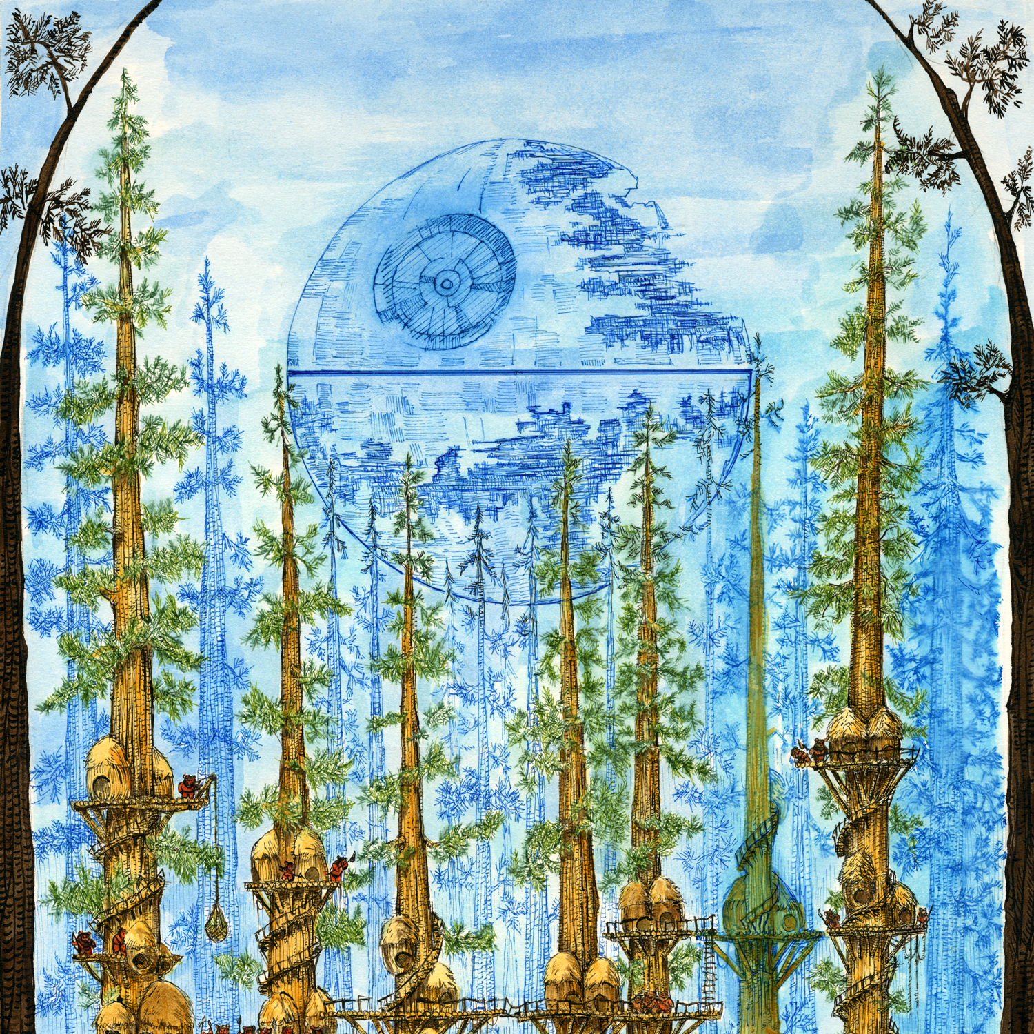 I recently created this pen and ink drawing of Endor from Return of The Jedi. The colour is built up with ink washes.