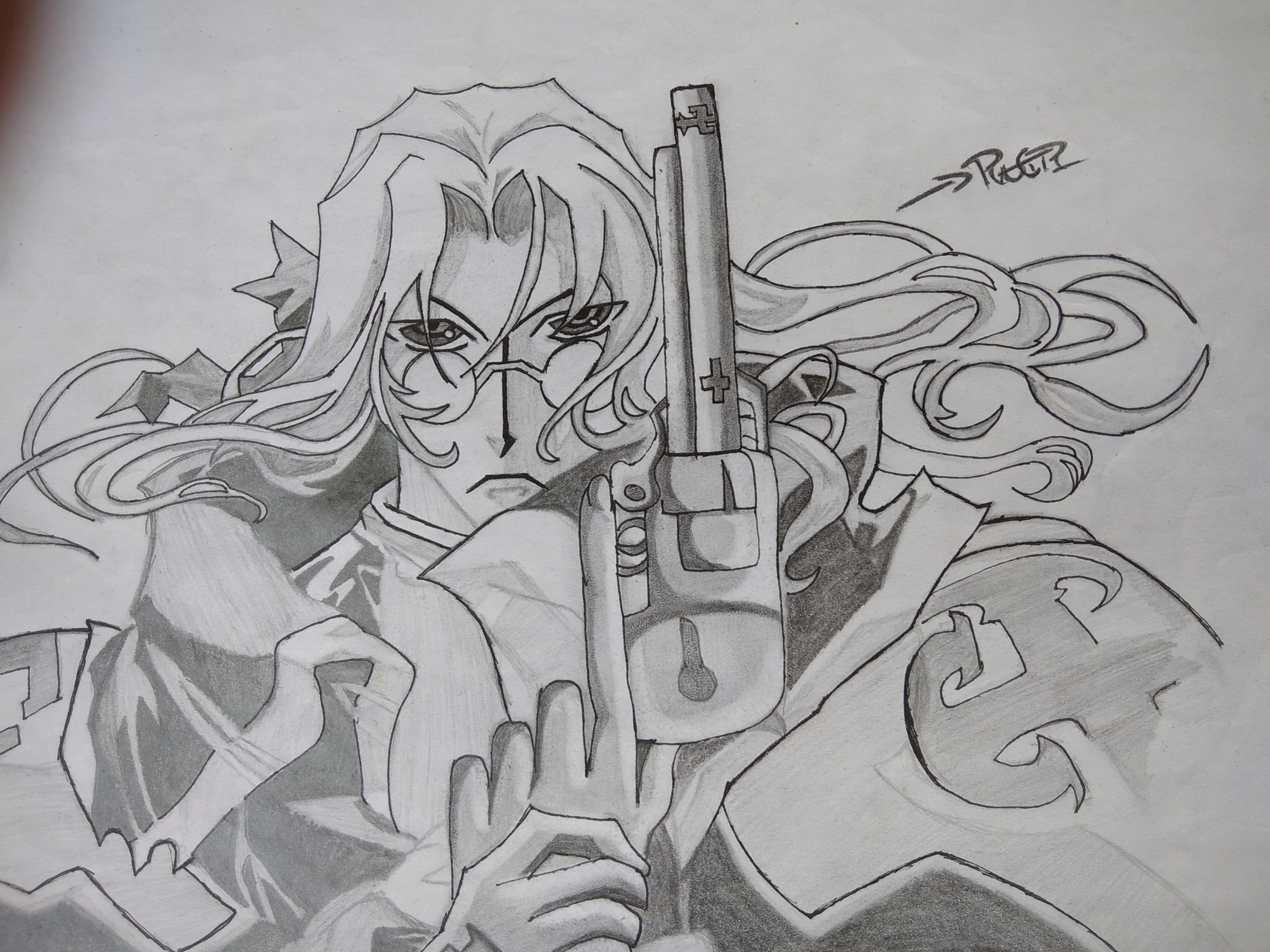Ilustracion en grafito, escala gris, referente a "D" Protagonista de la serie Vampire Hunter.