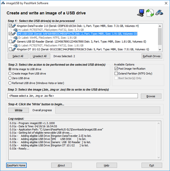 ImageUSB is a free utility which lets you write an image concurrently to multiple USB Flash Drives. Capable of creating exact bit-level copies of USB Flash Drive (UFDs), ImageUSB is an extremely effective tool for the mass duplication of UFDs. ImageUSB also supports writing of an ISO file byte by byte directly to an USB drive (*). ImageUSB can also be used to install OSFClone to a USB Drive for use with PassMark OSForensics™.