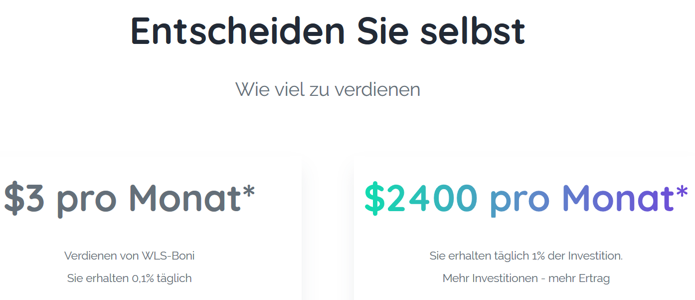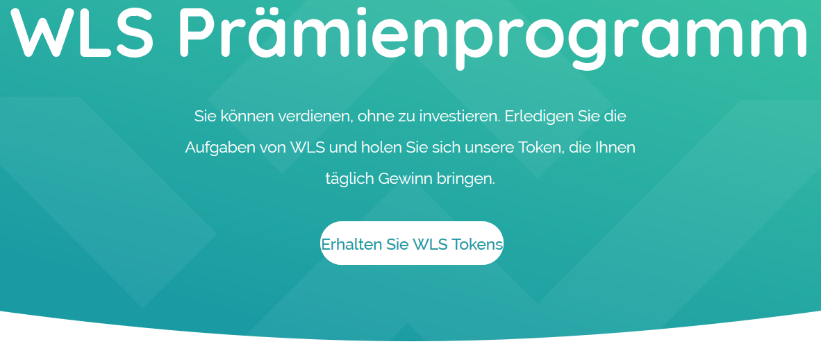 WLS Token ist eine Kryptowährung. Nach ICO wird unser Unternehmen WLS Token auf der wichtigsten Handelsplattform veröffentlichen. Und mit seiner Hilfe können Sie jetzt sofort Gewinn machen. Ihre WLS-Token generieren täglich echtes Geld. Je größer der WLS-Betrag auf Ihrem Konto, desto mehr Gewinn erhalten Sie täglich.