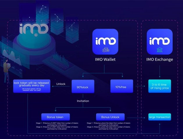 -Partner qualification:subscribe for 1 million IMO TokenUnlock condition:the IMO will unlock with following conditions. IMO token`s market price become over 1 USDT or finish to 365 rounds of pre-sale. IMO token will refund by dividend.