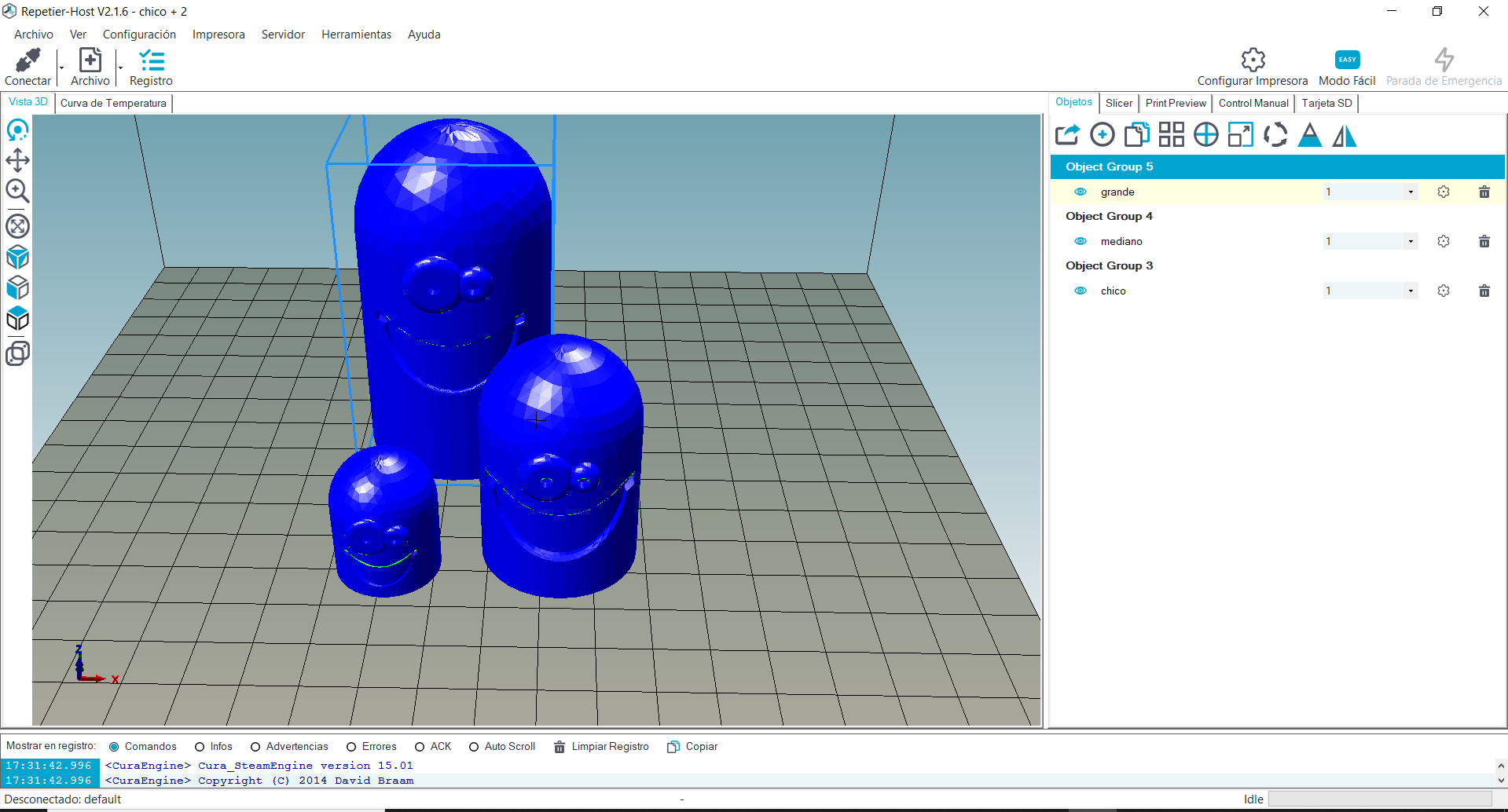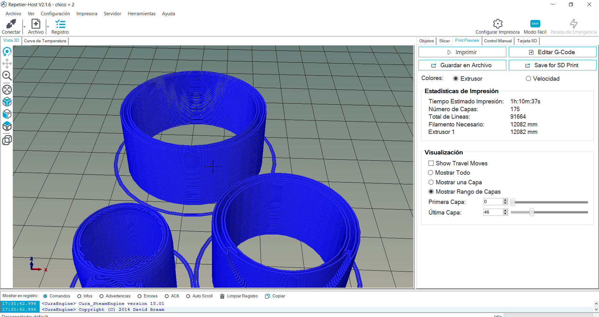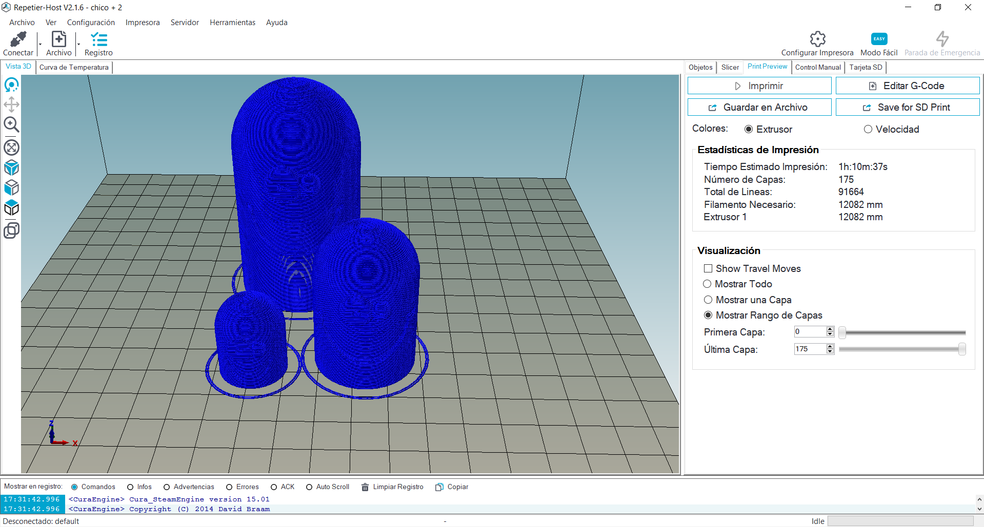 Con los archivos .STL a nuestra disposición pasamos los diseños a un programa para hacer corte en capas de nuestros diseños, esto va a darnos la posibilidad de generar el código que la impresora va a usar para fabricar la pieza. Ya con este paso terminado estamos listos para imprimir, cabe destacar que tal como fue impreso el juego son 4 colores lo que conlleva hacer