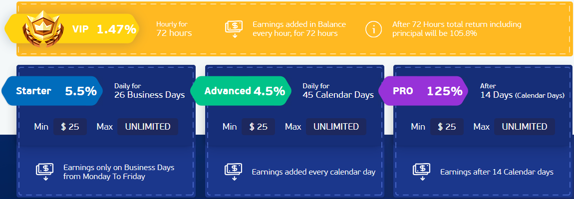 Vip üyeler için 72 saatte bir yapılan yatırım üzerinden % 1,47'lik bir garanti kazanç vaat ediliyor. Yani 100 bin TL yatırım yapan bir kullanıcı 72 saatte bir 1.470 TL garanti kazanç sağlayabilecek.