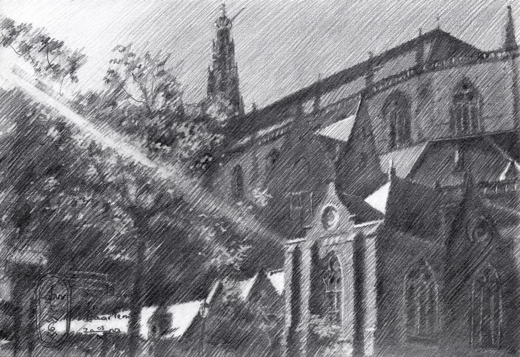 This graphite pencil drawing ‘St-Bavo in Haarlem – 03-10-23’ is a break from the continuous stream of cubist female forms. So it goes, on a whim I decided to postpone them for a while and return to sketching. Just for the fun of it, creating a drawing in one day. Well, not exactly one day. I started yesterday before art class started when I still had time before my students arrived. Only a couple of compositary lines to set things up. Today I did 95% in one go. This is the result.