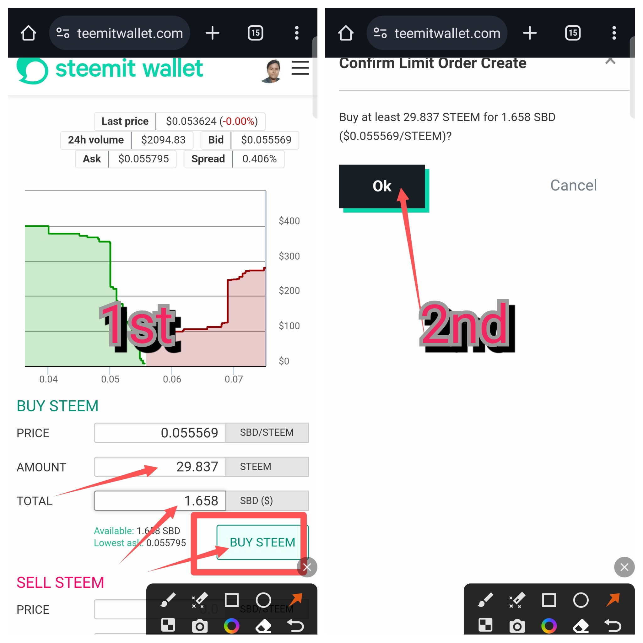 ➡️ তারপর Buy Steem অপশনে ক্লিক করতে হবে। এবার OK লেখা অপশনে ক্লিক করে ১০/১৫ সেকেন্ড ওখানেই থাকতে হবে।