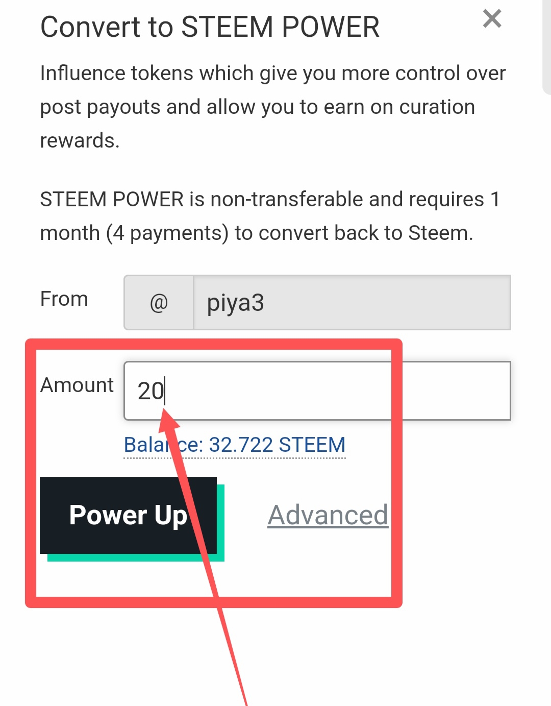➡️ এই মুহূর্তে SBD Convert করার পরে আমার ব্যালান্সের লেনদেন করার অপশনে 32.7...amount আছে। Club5050 maintain এর জন্য ১৭ power up করলেও হবে। কিন্তু আমি আমার club5050 কখনোই risk zone এ রাখবো না। তাই minimum 20+ আমি power up করবো।