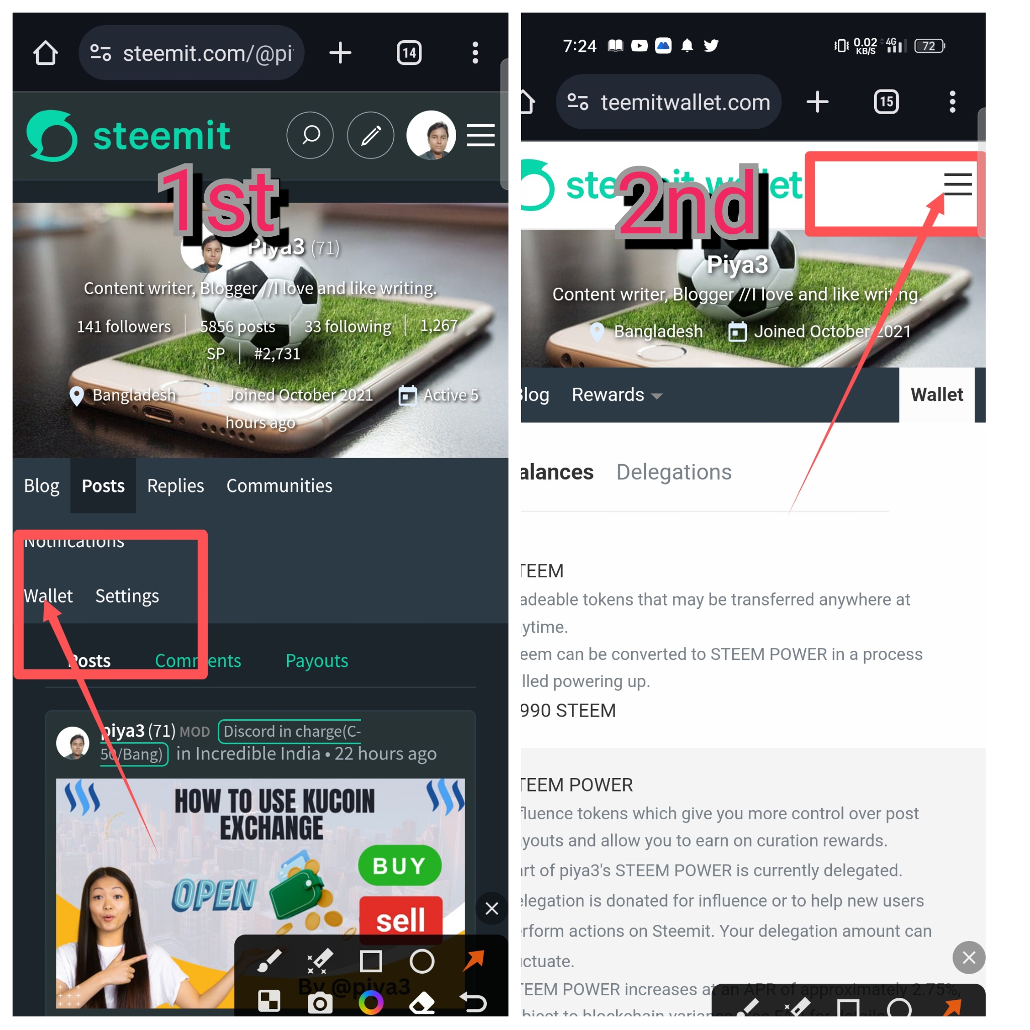 ➡️ প্রথমেই আপনারা আপনাদের প্রোফাইলে প্রবেশ করবেন। তারপর দেখবেন wallet অপশন আছে। আপনারা এদিক ওদিক না ভেবে wallet অপশনে ক্লিক করবেন। এবার আপনাদের wallet login না থাকলে ২য় স্ক্রিনশটের মতো একটি পেউজ সামনে চলে আসবে। তখন আপনারা মার্ক করে দেওয়া, তিনটি লাইনে ক্লিক করে দিবেন।