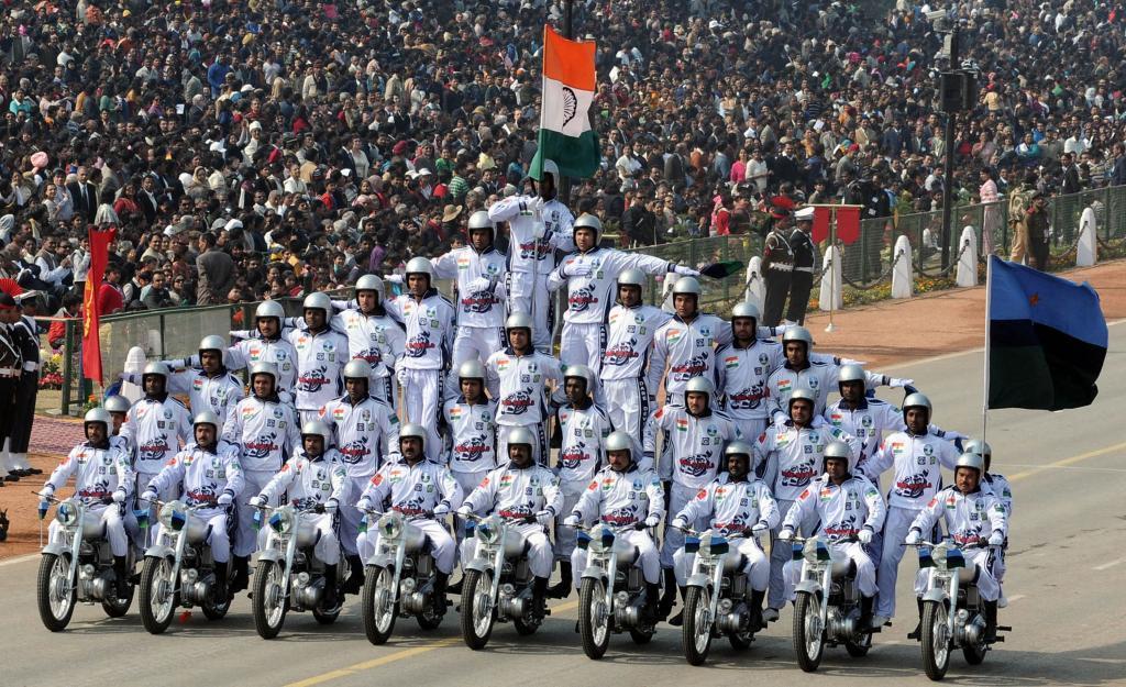 - on this auspicious occasion the INDIAN ARMY do a march pass in a disciplined manner, The air force fly fighter planes leaving behind our tri flag " TIRANGA".