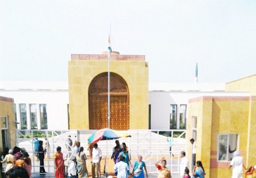 This is the entrance of the monument. It depicts the India Gate, compiled with a Chettinad door.
