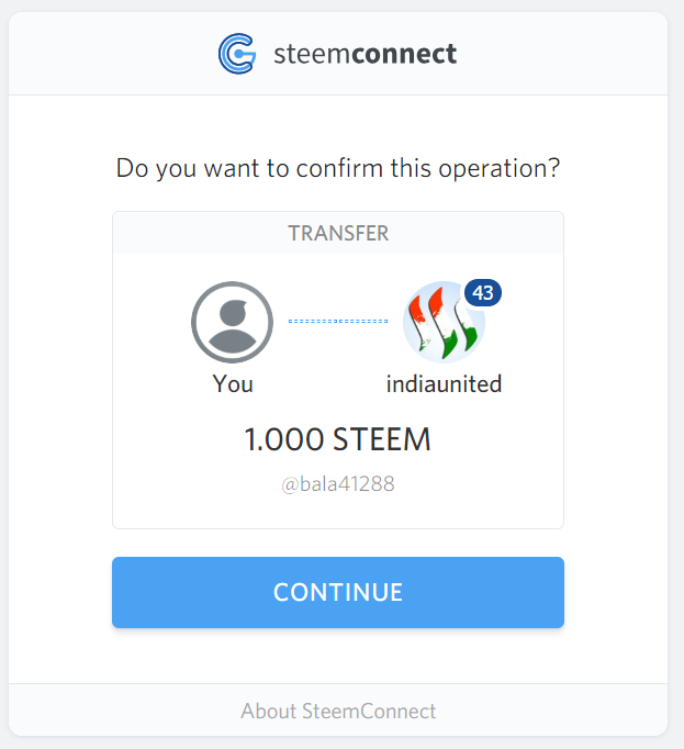 Members should send 1 STEEM or 1.5 SBD to @indiaunited with their steemit handle/steemit username in Memo. (Please do not provide any other information in the memo.)