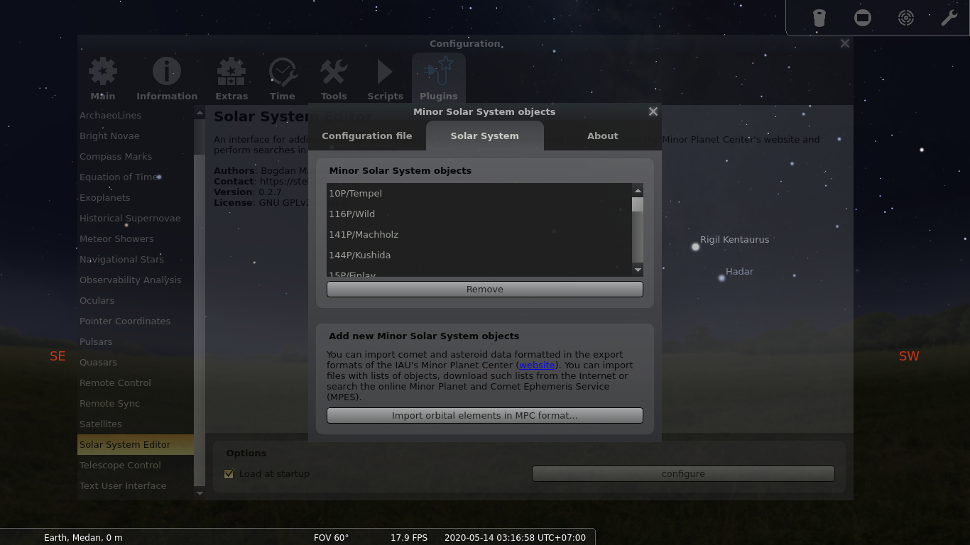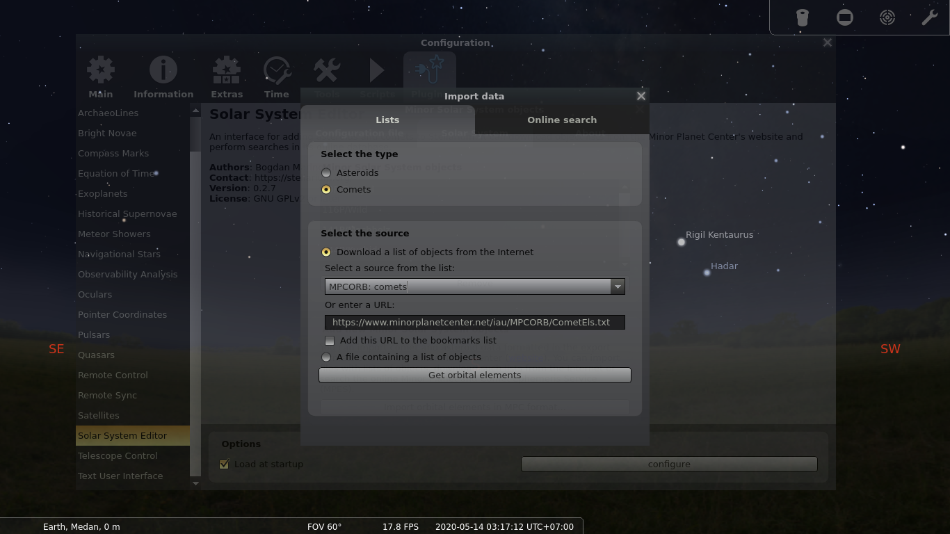 Untul menambahkan database komet terbaru, pilih menu Configuration Window