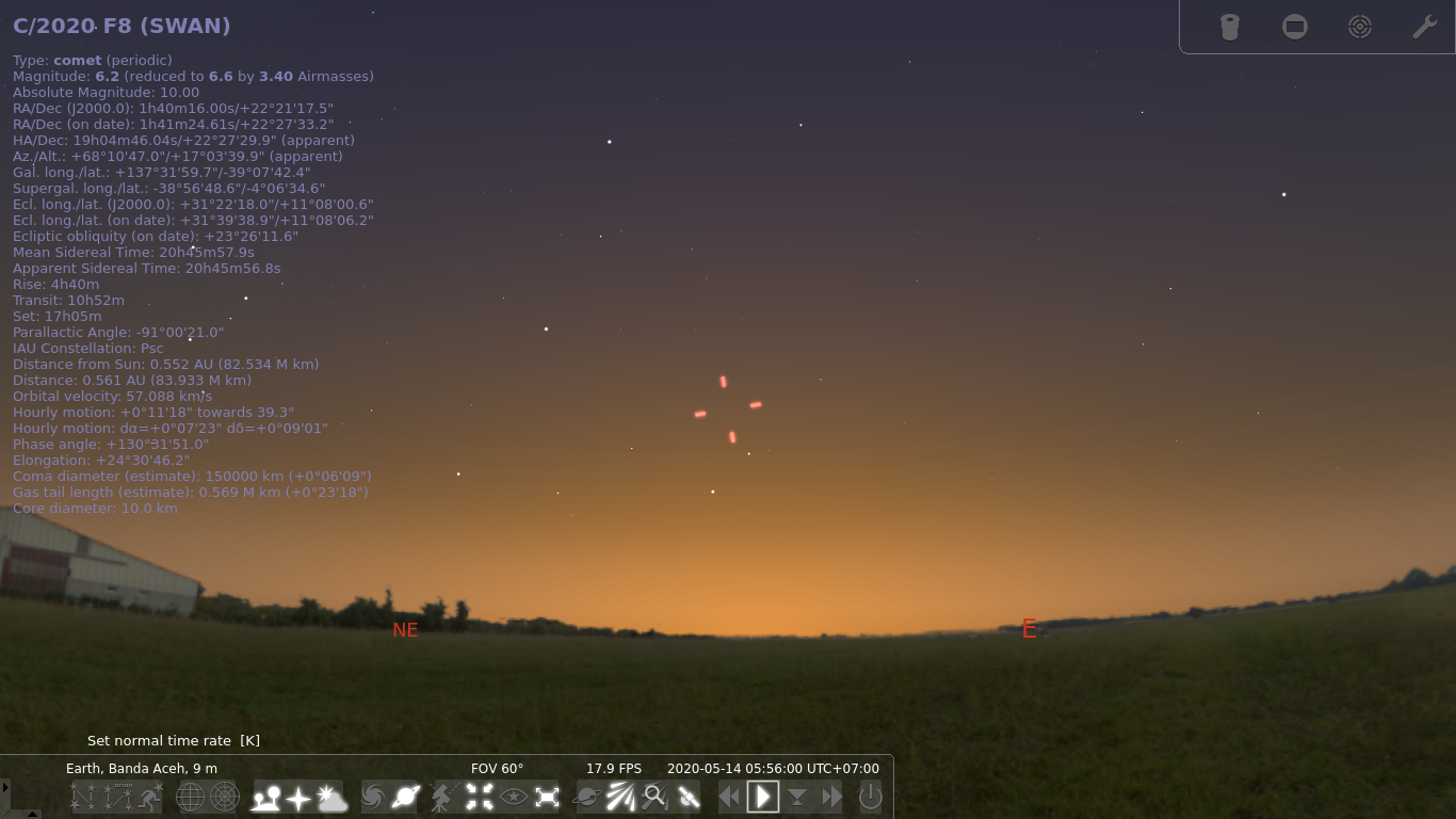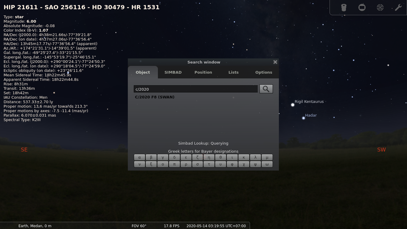 selanjutnya saat anda mencari objek komet yang sudah anda tambahkan tadi, maka komet tersebut bisa di track oleh aplikasi stellarium. Selamat mencoba!!!